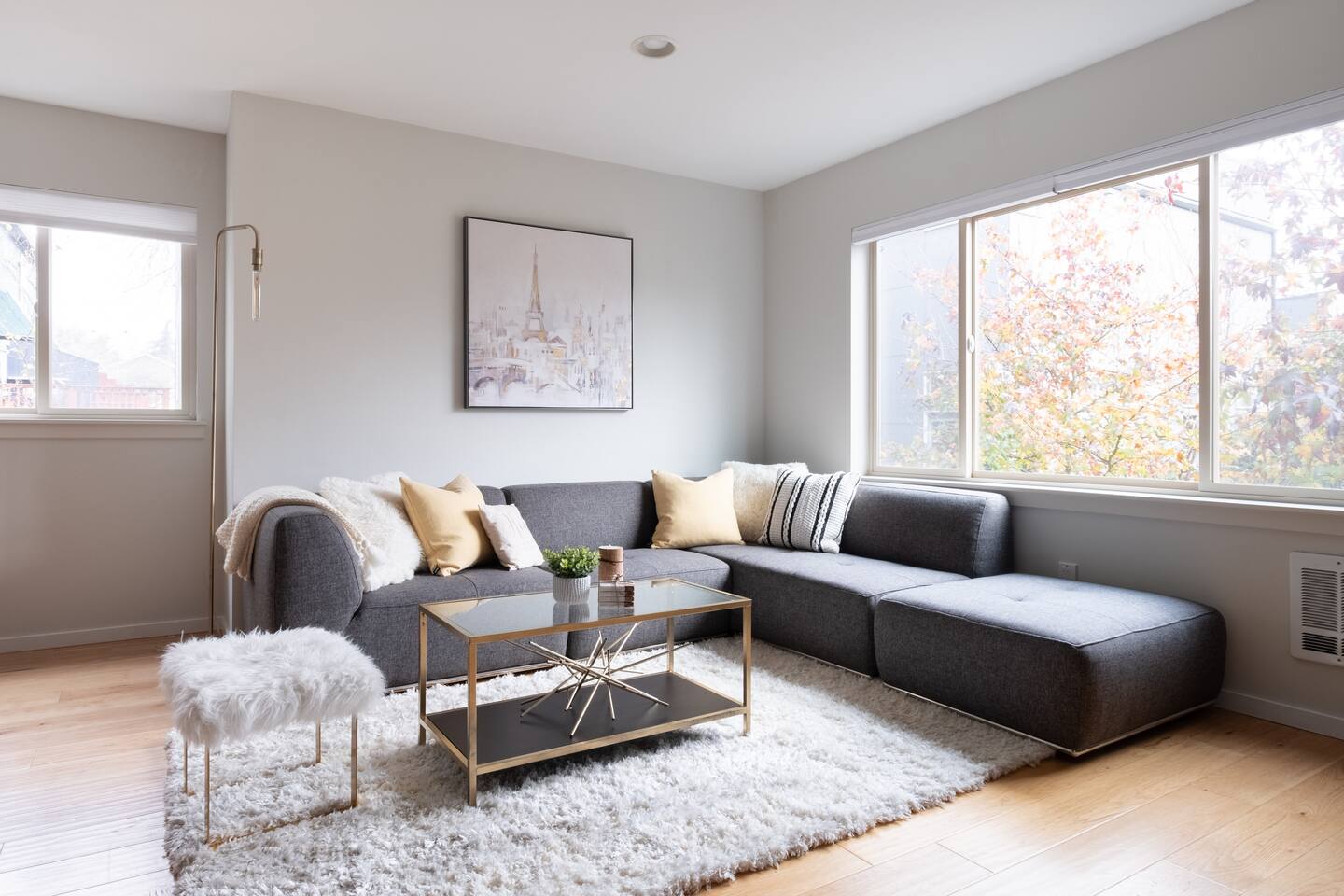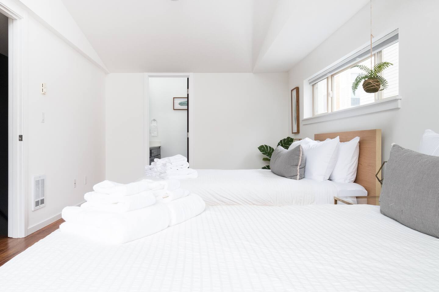 Home Highlights: - Private 3-story modern townhouse with secure keyless entry - Cozy living room with gas fireplace—perfect for cool Seattle evenings - Stylish designer decor, floating stairs, and vaulted ceilings - Fully stocked kitchen: Keurig + K-pods, gourmet teas, cookware, and utensils - Luxury Sealy queen beds with hypoallergenic white linens and down-alternative duvets - Ample closet space in every bedroom - 55" Smart TV with Netflix (no cable) - High-speed WiFi, efficient heating, and fans available for warmer days - In-unit washer/dryer for extended stays - Pack 'n Play available (Note: no baby pillows/blankets for safety) Parking: 1 reserved off-street parking space behind the townhouse (3rd spot from the left when facing the building) Home Layout: 1st Floor: - Bedroom #1: Queen bed + closet - Bedroom #2: Queen bed + closet - Full bathroom with tub 2nd Floor: - Open-concept living and dining area 3rd Floor: - Bedroom #3: Two queen beds + closet, vaulted ceilings, en-suite double-vanity bathroom Queen air mattress available upon request for groups larger than 8 Nearby Attractions: - Columbia City Historic District, Columbia Park, Rainier Arts Center - 10 to 15 min walk - Mount Baker Ridge Viewpoint Park - 10 to 15 min walk - Mount Baker Park & Lake Washington Blvd Trail - 10 to 15 min walk - Flo Ware Park - 10 to 15 min walk